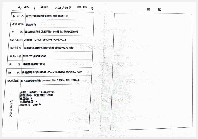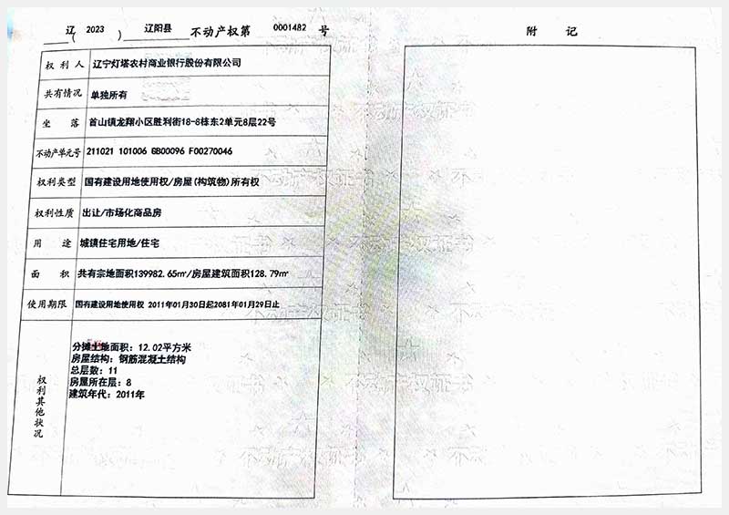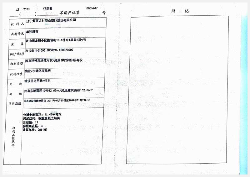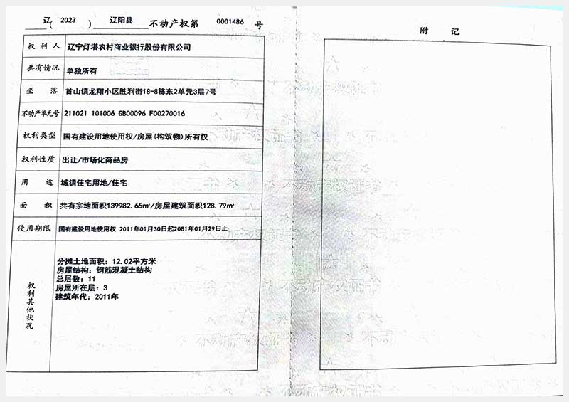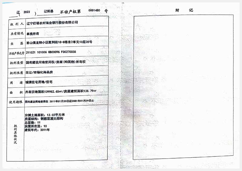 名稱:遼陽(yáng)市首山鎮(zhèn)龍翔小區(qū)勝利街18棟房產(chǎn) 面積:102.06㎡—162.71㎡ 瀏覽次數(shù):295