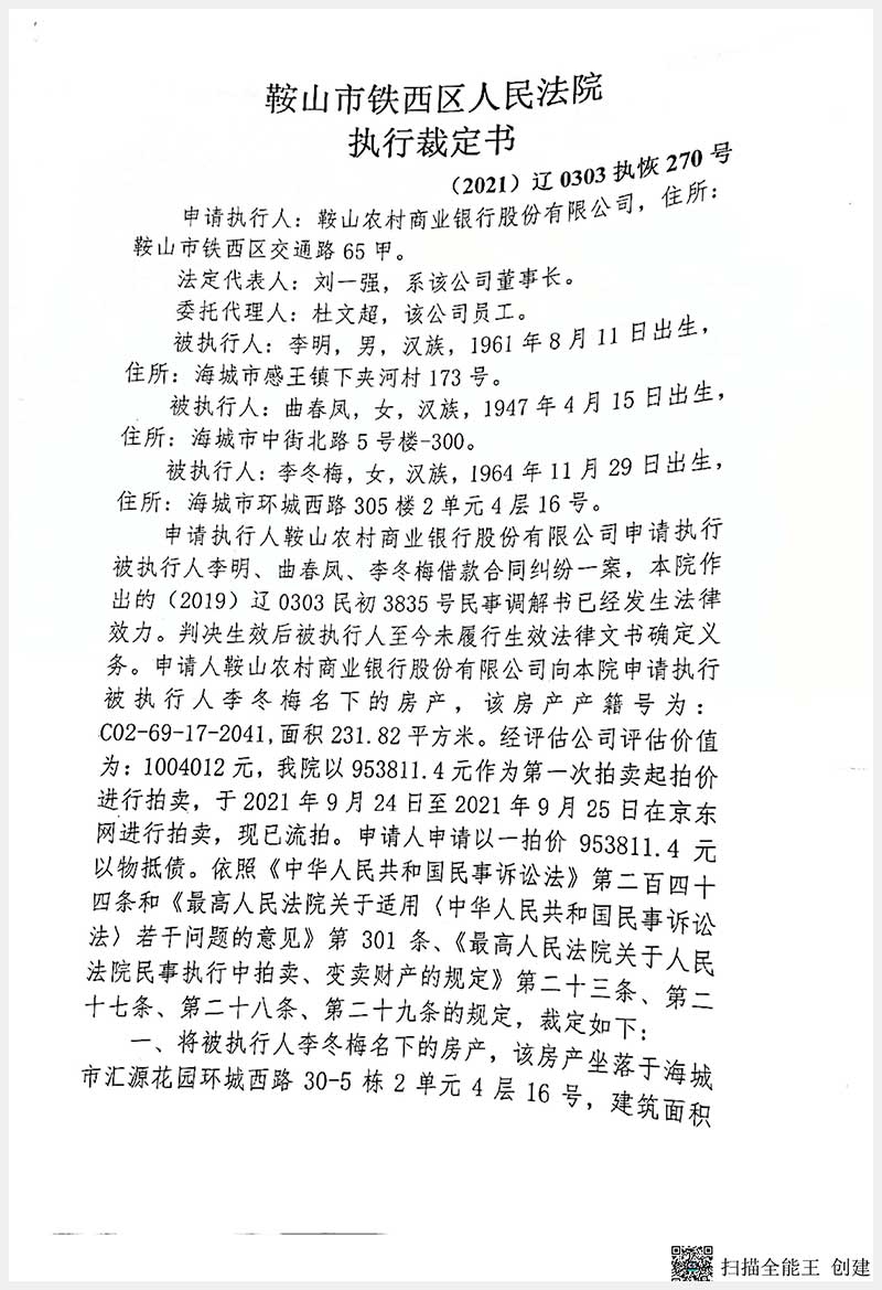 109號 海城市興海管理區(qū)站前街三明委匯源花園環(huán)城西路30-5棟2單元4層16號房產(chǎn)